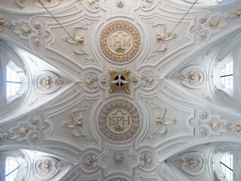 - Innenraum, Langhaus mit Tonnengewölben und Stuckaturen der Wessobrunner Schule