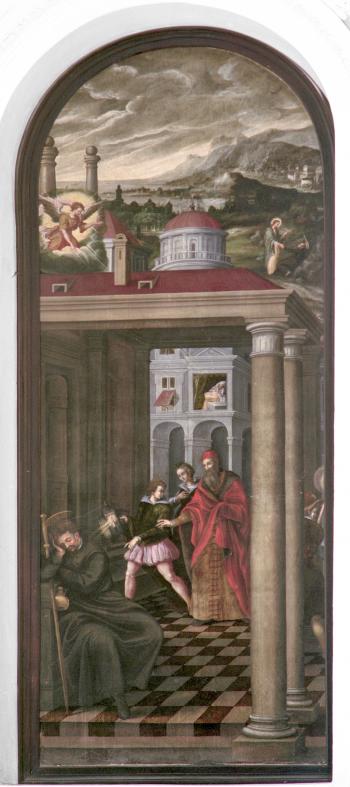 Dieses großartige Altarbild mit seinem vergoldeten Rahmen verdient eine längere Betrachtung (Es würde sich lohnen, dies mit einem Fernglas zu tun): Zuoberst ist die Dreifaltigkeit auf einer Wolke dargestellt, darunter in der Mitte folgt in dunkelblauem Gewand die Mutter Gottes im Strahlenkranz, von Engeln umgeben. Auf einem schwungvollen Wolkenbogen von links oben nach rechts unten sind verschiedene Heilige zu erkennen: Petrus mit den Schlüsseln, Paulus mit dem Schwert, drei Männer diskutierend und rechts unten ein Papst mit drei Bischöfen, während in der linken Ecke nur dunkle Gestalten zu erkennen sind, von denen der Mann im Hintergrund als Selbstportrait des Künstlers gedeutet wird. Aber hinter diesen vordergründigen Gestalten sieht man tief hinein in den Himmel mit vielen Frauen und Männern und Kindern als Engelchen. Eine unglaubliche Tiefenwirkung!